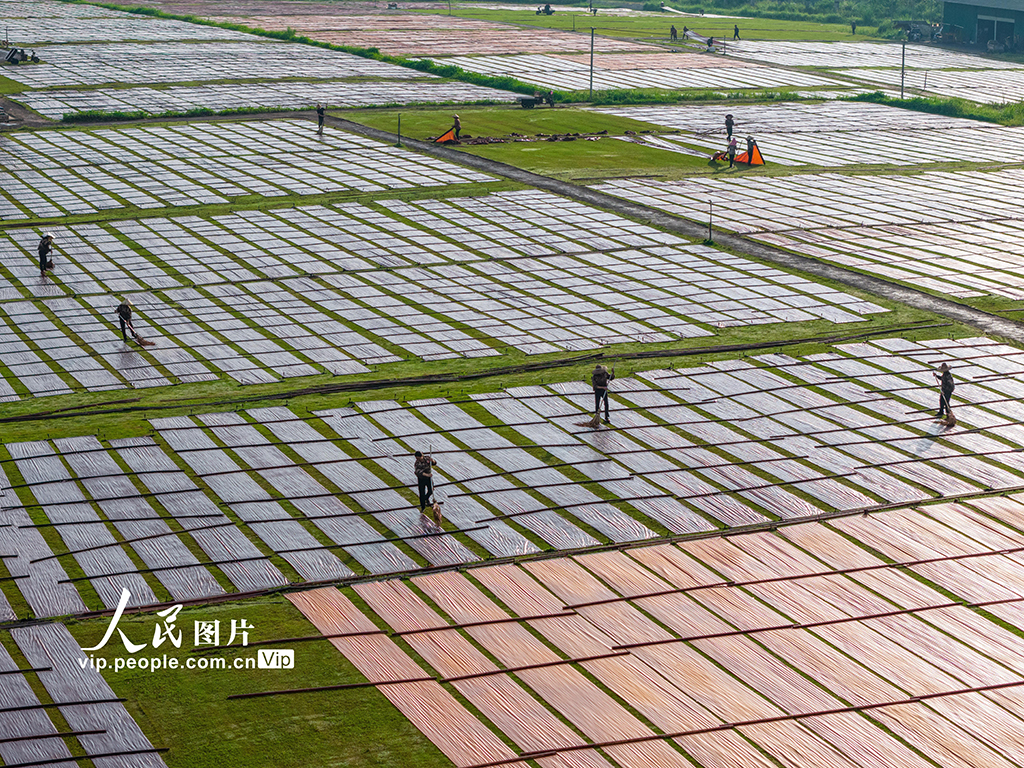 2025年8月26日,廣西梧州市蒙山縣一家香云紗企業的曬場上,工人們正忙著晾曬香云紗。吳廣升…