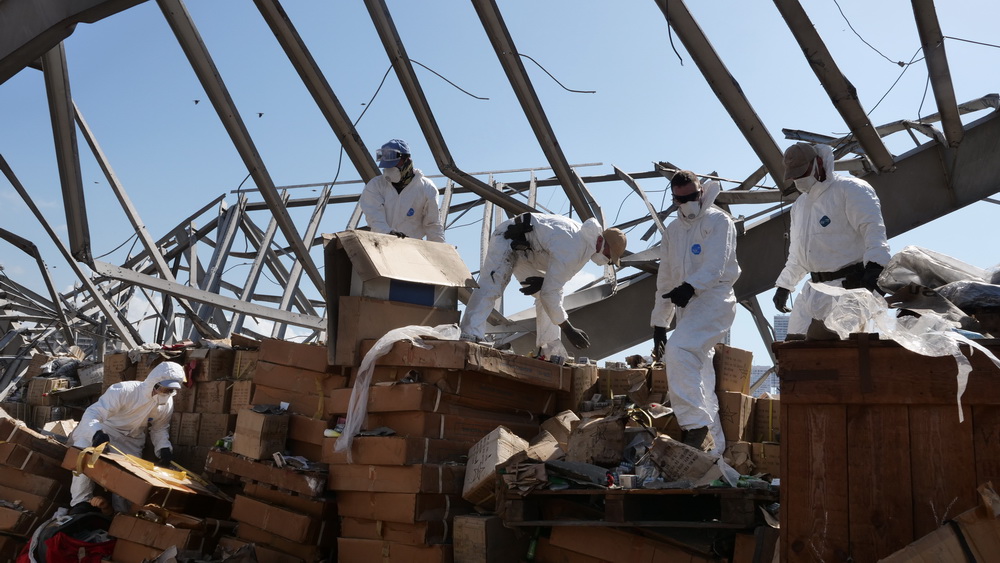 10月1日,中國維和官兵在黎巴嫩貝魯特港爆炸廢墟中與其他國家維和官兵一起…