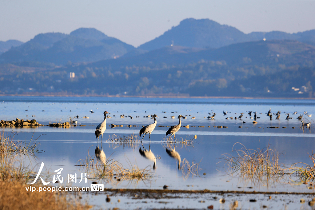 2024年11月30日,貴州省威寧自治縣草海國家級自然保護區,黑頸鶴等越冬候…