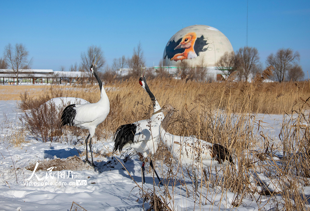 2024年12月2日,冬日里的黑龍江省齊齊哈爾市扎龍自然保護區,丹頂鶴在馴化…