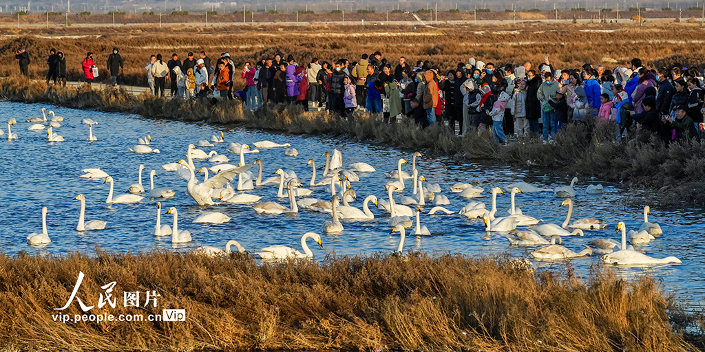 2024年12月7日,成群大天鵝在山西省運城市鹽湖濕地棲息越冬,吸引了眾多游…