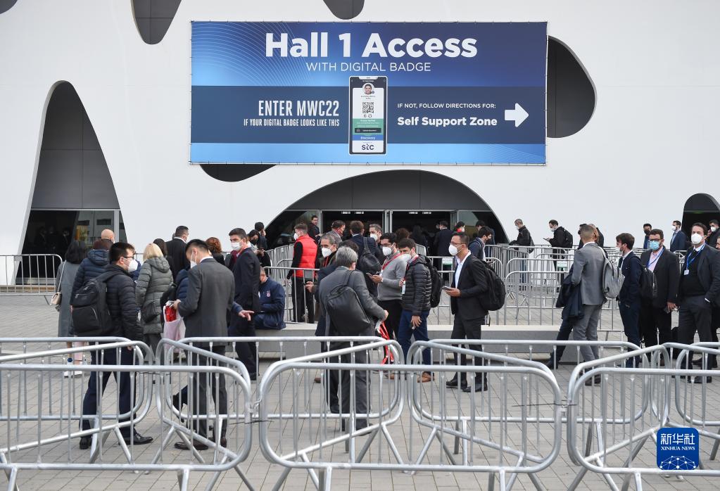 2月28日,在西班牙巴塞羅那,人們排隊進入2022世界移動通信大會場館?!?/a>