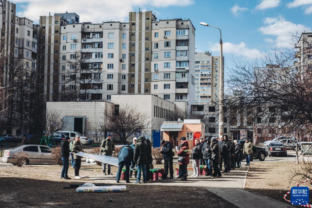 3月17日,人們在烏克蘭基輔領取用來遮擋窗戶的塑料布。 根據烏克…