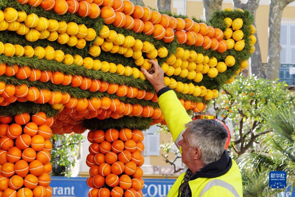 2月9日,一名工作人員在法國南部小城芒通裝飾檸檬節藝術裝置。 2…