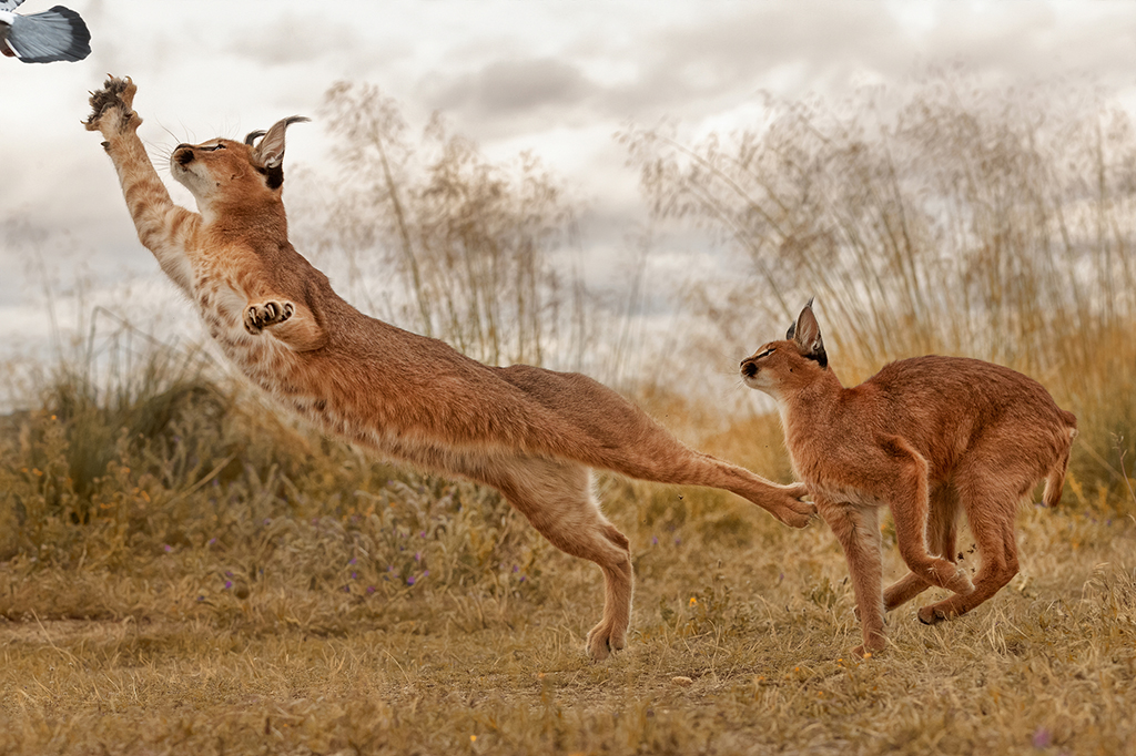 近日,西班牙Toledo,一只15個月大的雄性野生獰貓高高跳起,試圖捕鳥,一…
