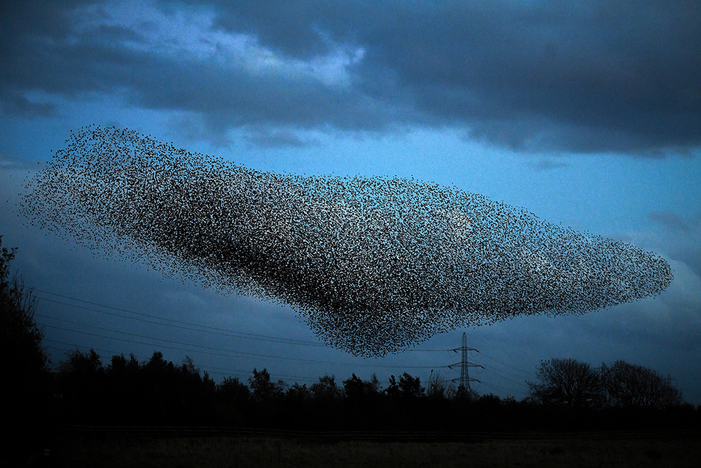 當地時間2020年10月20日,英國蘇格蘭格雷特納,夜幕降臨前,椋鳥聚集在一…