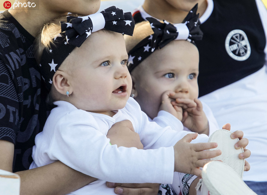 當地時間2019年8月4日,烏克蘭基輔當地眾多雙胞胎和多胞胎萌娃們跟著父母一…