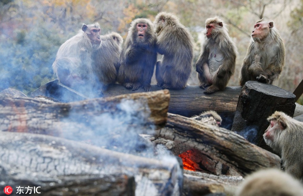 當地時間2018年12月19日,日本愛知縣犬山市,日本猿猴中心內的猴子們圍在…