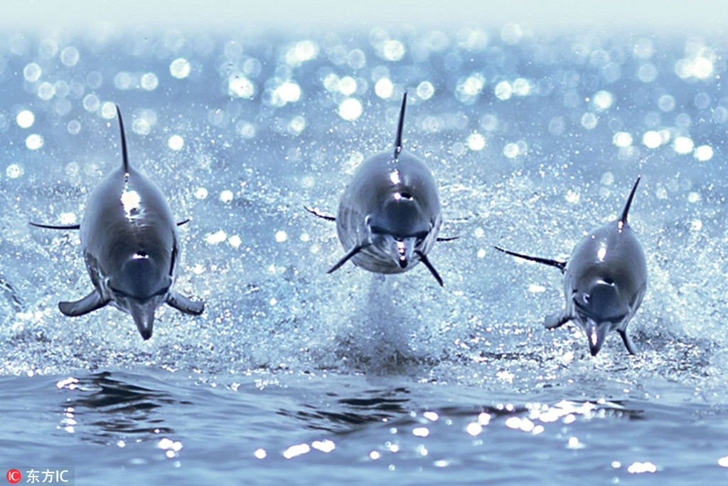 近日在阿曼的馬斯喀特海岸,三頭海豚一起躍出水面,乍一看上去這就像是三架戰斗機…