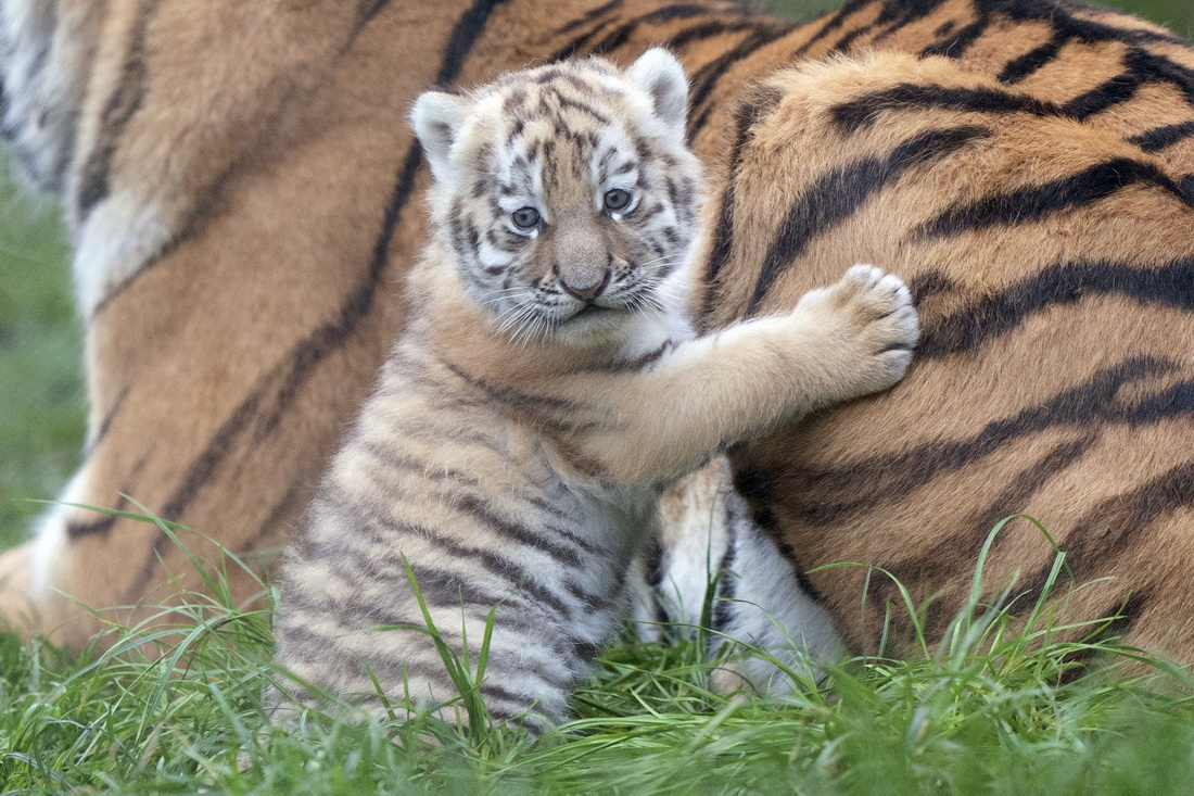 這是11月24日在英國諾??税嗉{姆動物園拍攝的虎媽媽與它七周大的幼崽。新華社…
