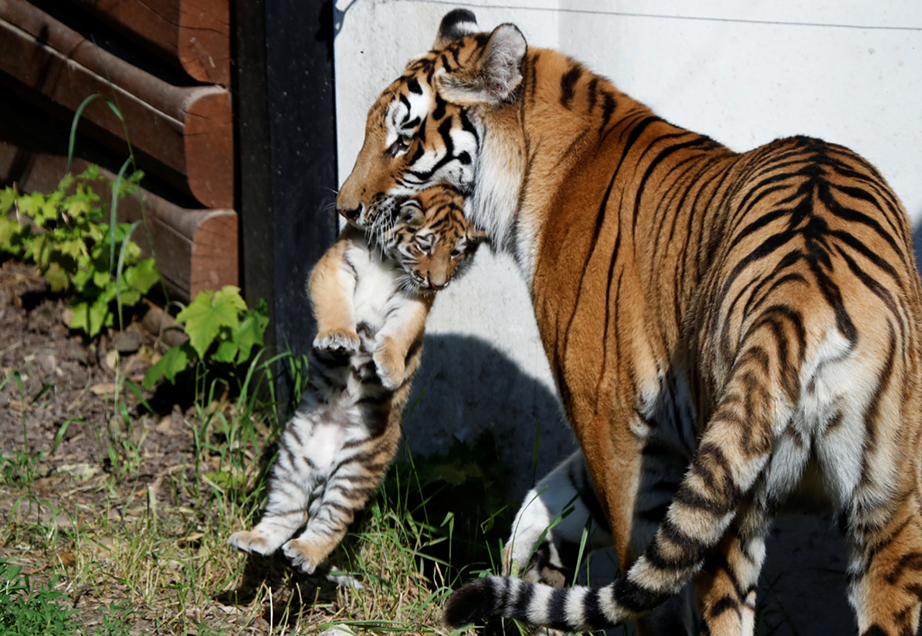 6月7日,一只母虎在波蘭普沃茨克的動物園叼著一只幼崽。新華社/路透 …