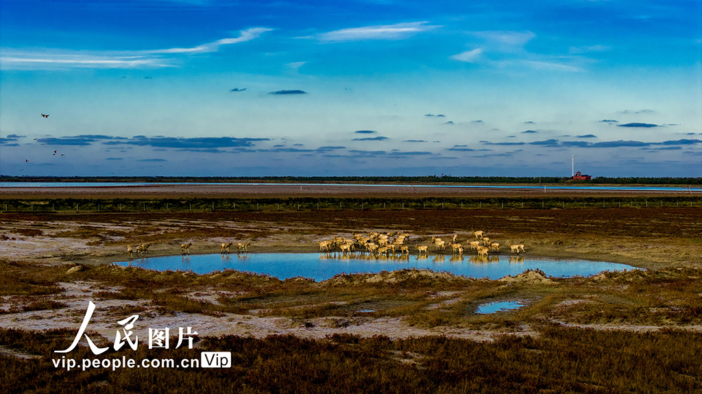 深秋時節,江蘇東臺條子泥濕地,大片鹽蒿地由青綠漸變為艷紅,野生麋鹿在其間棲息…