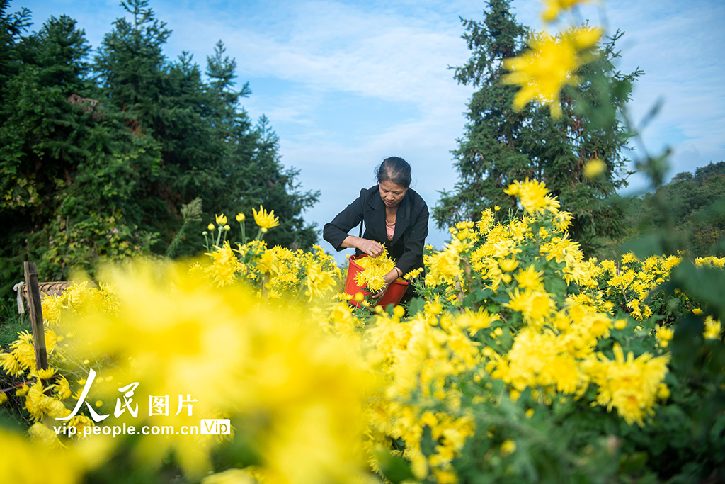 2025年11月4日,在湖南省漣源市黃栗村金絲皇菊種植基地,農民正在采摘、晾…