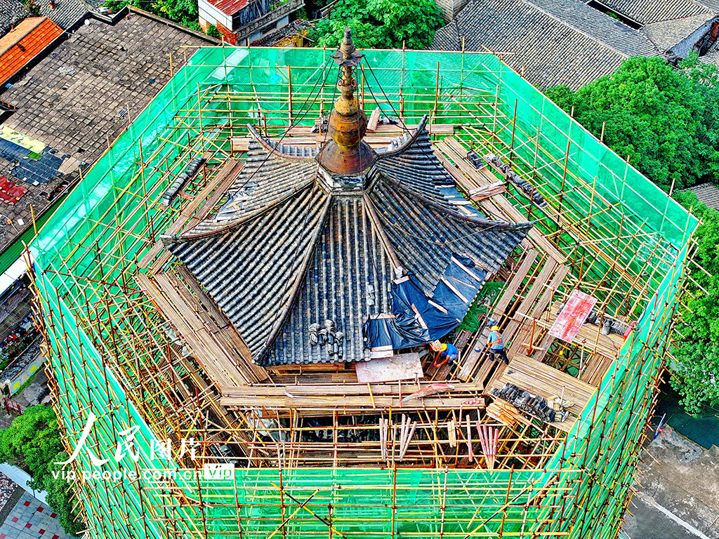 2024年6月17日,工人在江西省贛州市章貢區修繕宋代慈云塔塔頂瓦檐。 慈云…
