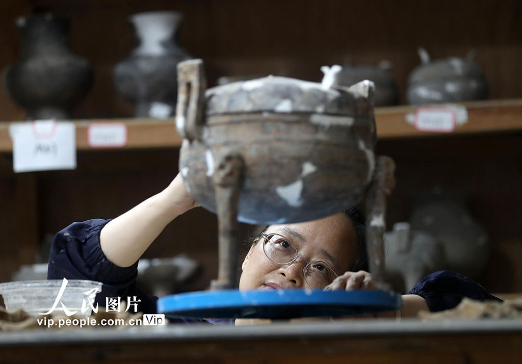 2024年7月4日,在湖北省荊門市博物館文物修復室,技術人員正在對出土的器物…