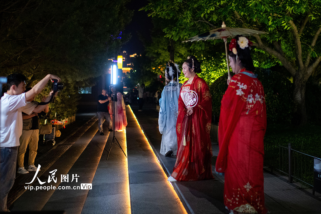 2024年5月12日,西安大唐不夜城燈光璀璨,眾多游客身著漢唐服飾,身臨其境…