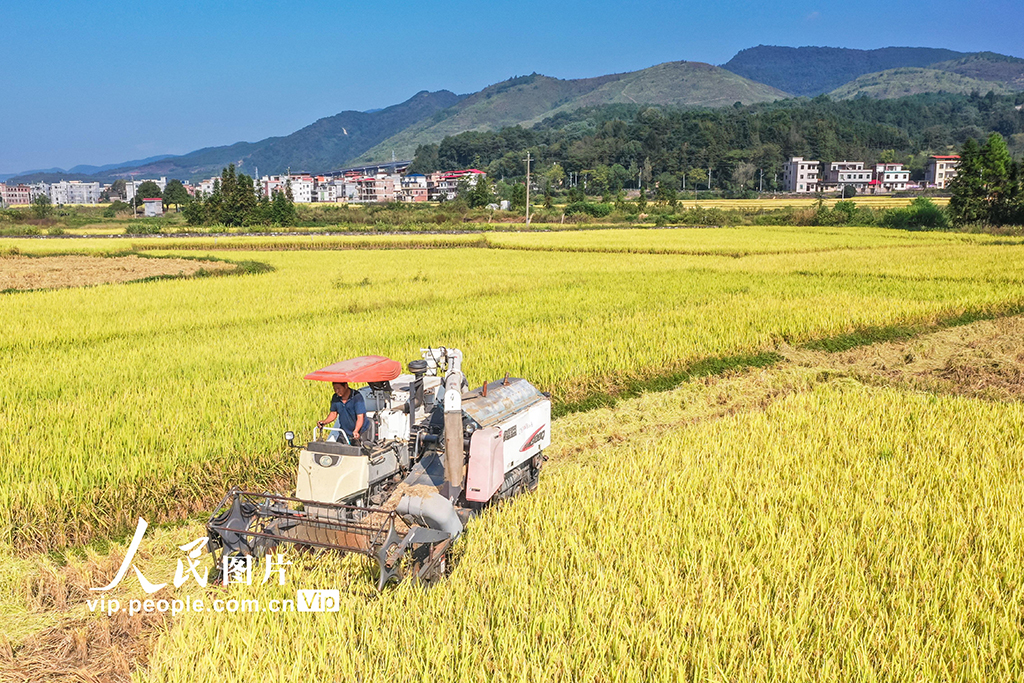 2025年10月12日,湖南省永州市藍山縣土市鎮團結村,村民駕駛收割機在田間…