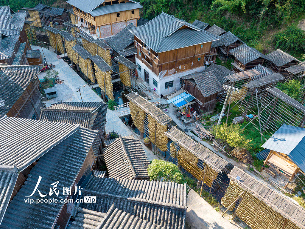 金秋時節,貴州省黔東南苗族侗族自治州從江縣高增鄉占里村的侗族村民們正在晾曬糯…