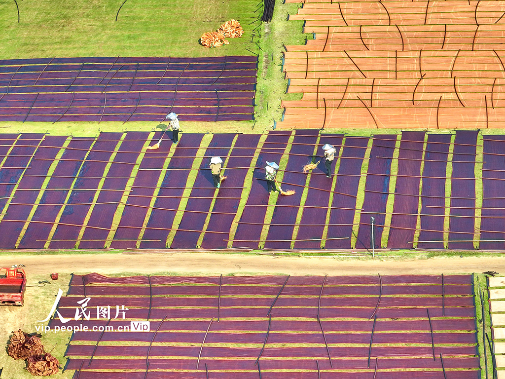 2025年10月12日,在廣西梧州市蒙山縣蒙山鎮的一家絲綢企業曬場內,工人們…