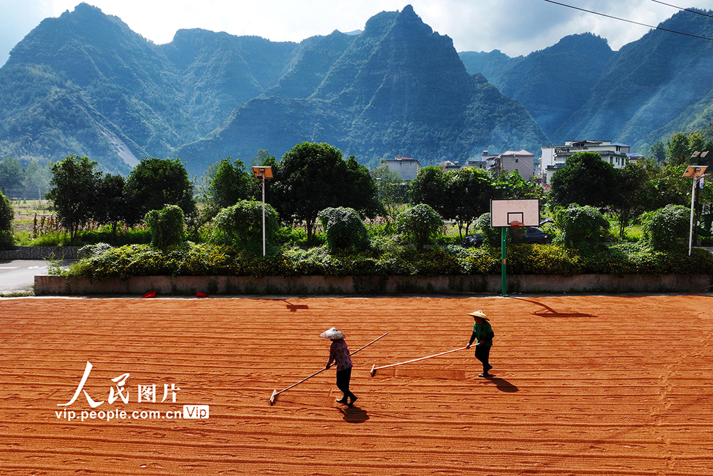 2025年10月5日,重慶市黔江區出現晴好天氣,農民們抓住時機晾曬高粱等農作…
