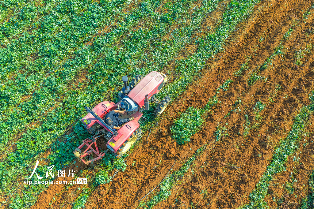 2025年10月9日,在湖南省永州市東安縣石期市鎮新華村,農民正在收獲紫紅薯…
