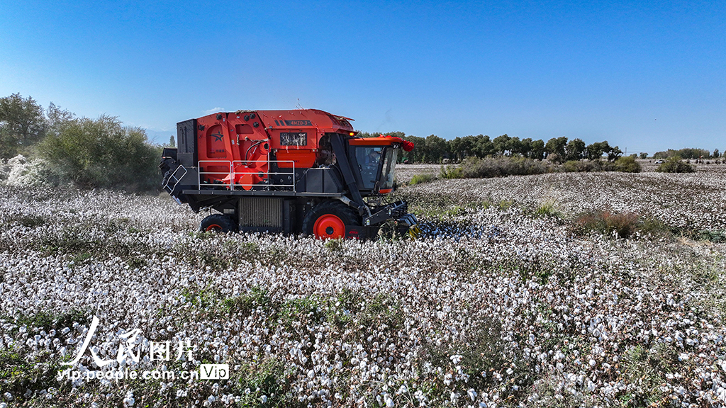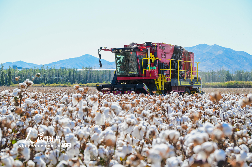 2025年10月4日,新疆昌吉回族自治州呼圖壁縣大豐鎮聯豐村,采棉機在棉田里…