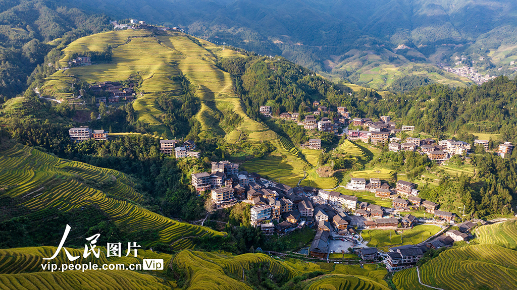 金秋時節,廣西桂林龍勝的龍脊梯田漫山遍野稻谷金黃,“豐”景如畫。曾祥忠攝(人…