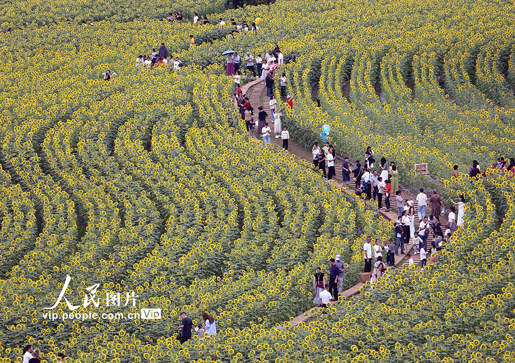 2025年10月5日,四川省峨眉山市峨秀湖畔的向日葵競相綻放,吸引不少游客前…