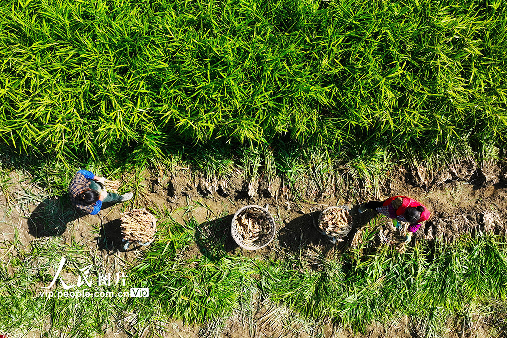 2025年10月28日,村民在重慶市黔江區太極鎮金團村富鍶生姜基地采挖富鍶生…