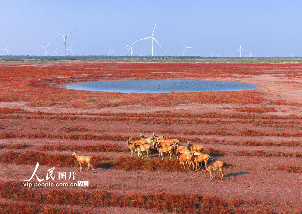 2025年10月28日,江蘇省鹽城市東臺條子泥濕地,一群麋鹿在堿蓬草鋪就的“…