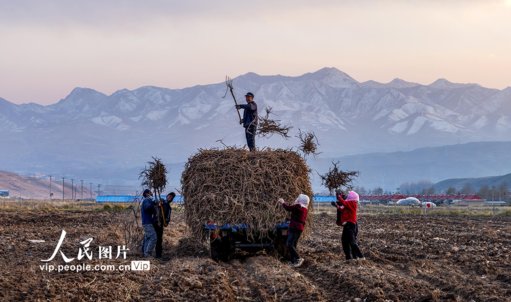 2025年10月28日,甘肅省武威市天??h華藏寺鎮黃草川村,藥農在田間加緊采…