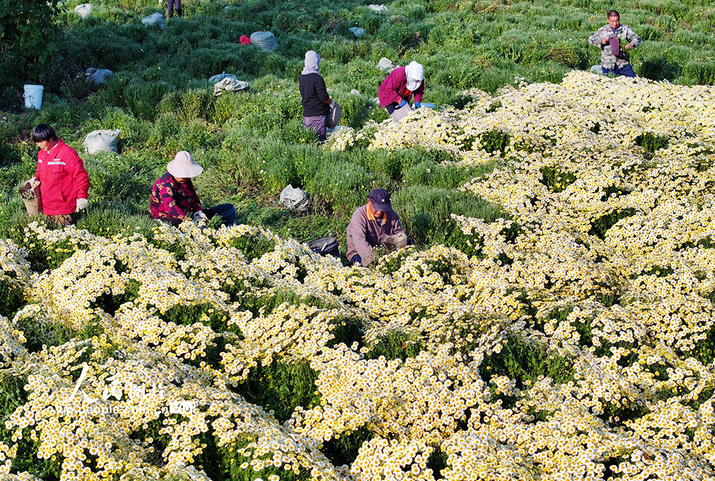 金秋時節,安徽省淮北市相山區渠溝鎮徐集村的藥用菊花田一片繁忙,農戶們搶抓晴好…