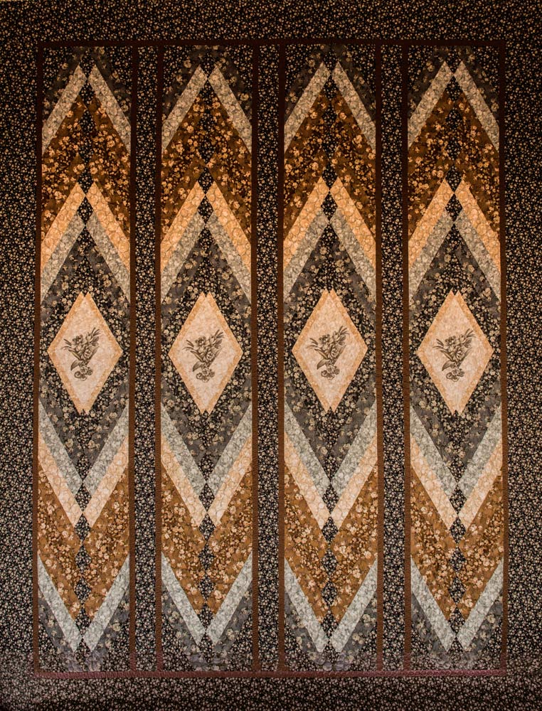 拼布作品的制作過程是一個考驗耐心與毅力的過程,每一幅作品都是由成千上萬塊布錯綜復雜拼接而成。圖中這幅作品做法為法國結,由于這個作品的布料都是六十度斜裁,制作過程中布料的易變形加大了制作難度。文瑞利用將近兩個月時間創作了這幅2米乘2.5米的大型作品,完美的配色和手藝,令作品大氣、震撼!鞍橈w來破曉煙”是文瑞要表達的意境 。雖然在一般人看來不可思議,但是文瑞確實以強大的內心將他人看來寂寞枯燥的手工操作視為最享受的時刻,她說:在陽光下,聽著音樂做手工,那是一種飽滿的孤獨、充實的寂寞,我就愛那種狀態。