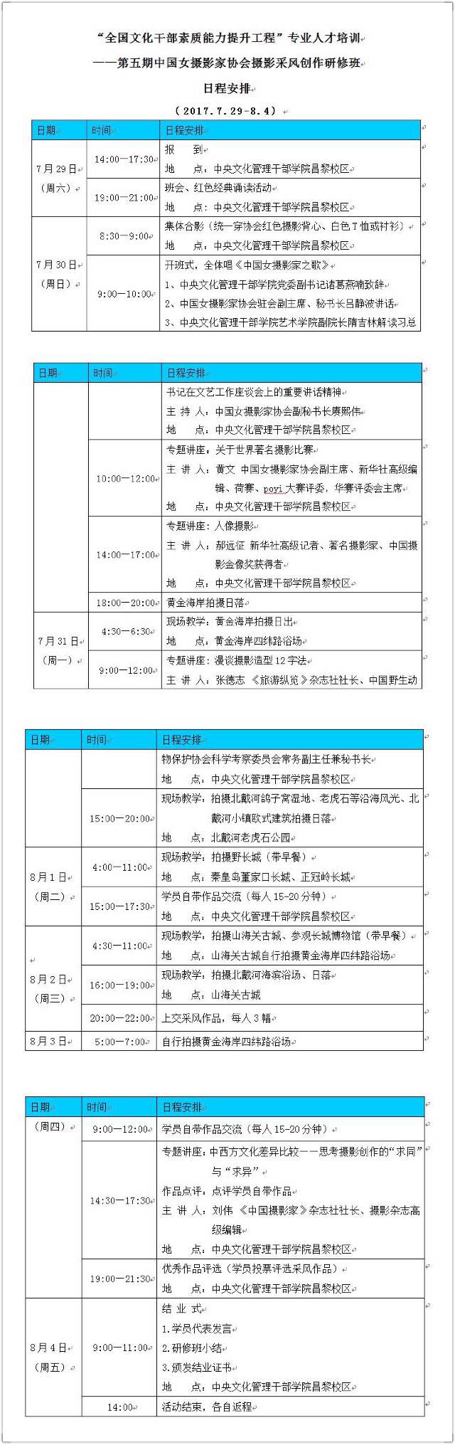 五、日程安排:培訓為期7天,將采用專題講座、作品點評、攝影采風、學員講壇、研討交流、學員投票評選作品等形式開展教學工作,具體詳見“‘全國文化干部素質能力提升工程’專業人才培訓——第五期中國女攝影家協會攝影采風創作研修班日程安排”(附件1)。