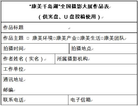 投稿作品以光盤(CD-R或DVD-R)、U盤存儲形式郵寄至:北京市東城區東四十二條48號中國攝影報社活動部 “康美千島湖攝影大展”辦公室收(100007)
