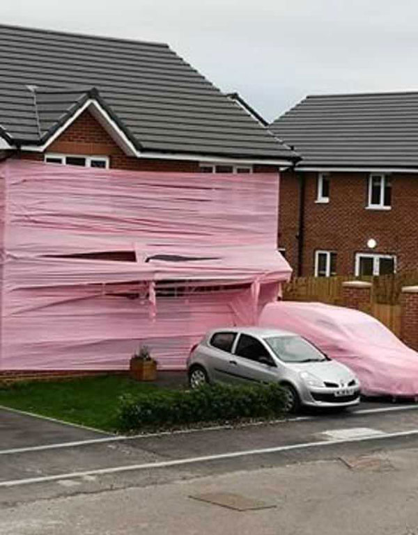 英夫婦蜜月歸來發現房子汽車被粉色塑料布包裹
