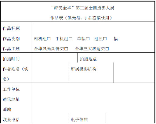投稿作品以光盤(CD-R或DVD-R)、U盤存儲形式郵寄至:北京市東城區東四十二條48號中國攝影報社活動部“第三屆金華攝影大展”辦公室收(100007)