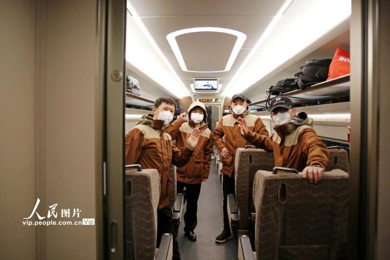 2020年2月20日,中國攝影家協會主席李舸、《中國攝影》報副總編輯柴選、中國文聯攝影藝術中心網絡信息處編輯陳黎明、中國文聯攝影藝術中心原主任劉宇(從左至右)踏上開往武漢的高鐵。張雙雙 攝