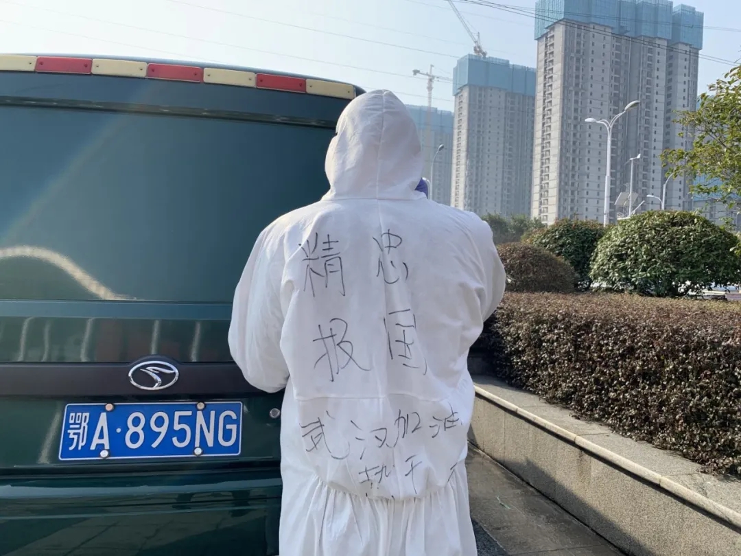 2月22日,武漢客廳方艙醫院門口,一輛運輸物資的郵政駕駛員防護服上寫著“精忠報國”“武漢加油”等字樣。柴選 攝