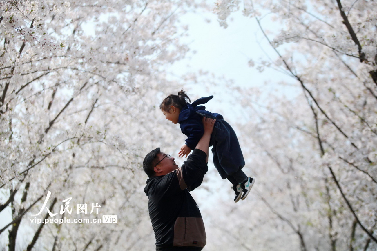 3月25日,櫻花樹下,一位父親將自己的孩子高高舉起。隨著氣溫回升,江蘇省揚州市邗江區甘泉街道長塘村揚州櫻花園中的櫻花競相綻放,吸引了市民前來踏青賞花。孟德龍/人民圖片