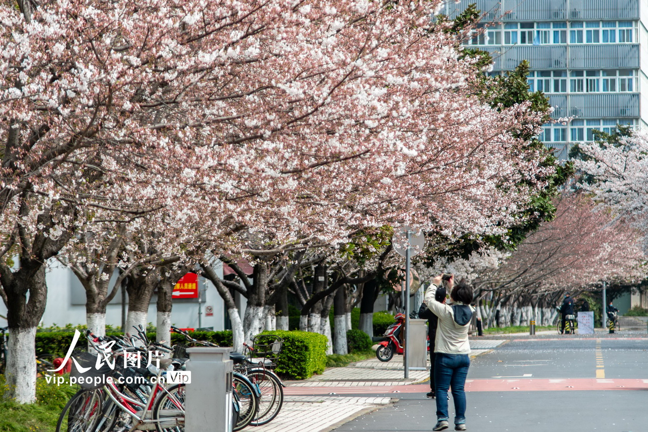 3月25日,上海同濟大學愛校路上的櫻花已經成片開放,市民在校門外駐足賞櫻和拍照。由于疫情原因,目前校園封閉管理,校外人員不能進入校園。同濟大學聯合眾多平臺,開啟“云賞櫻”通道,為廣大市民和網友直播校園美景。王岡/人民圖片