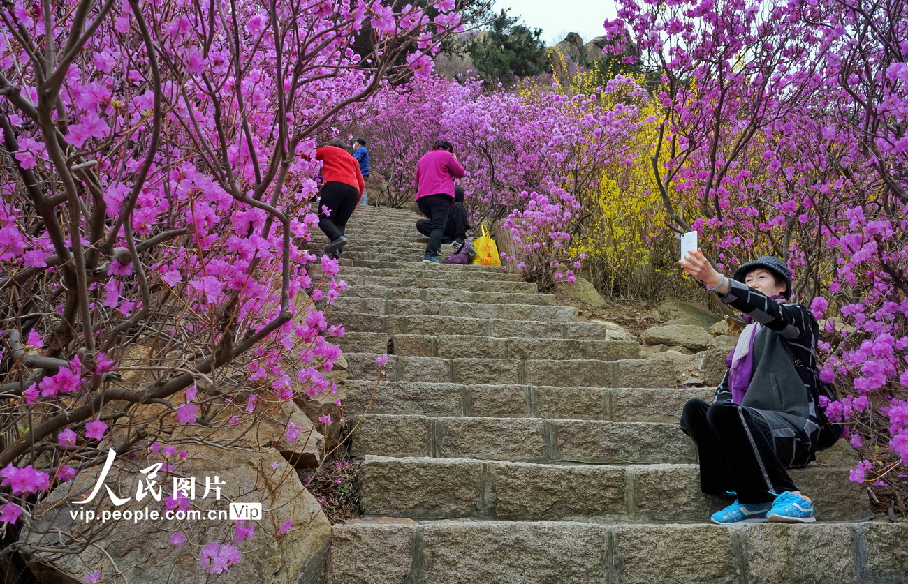 3月24日,青島大珠山風景區恢復開放,漫山盛開的杜鵑花吸引了很多市民前來。董志剛/人民圖片