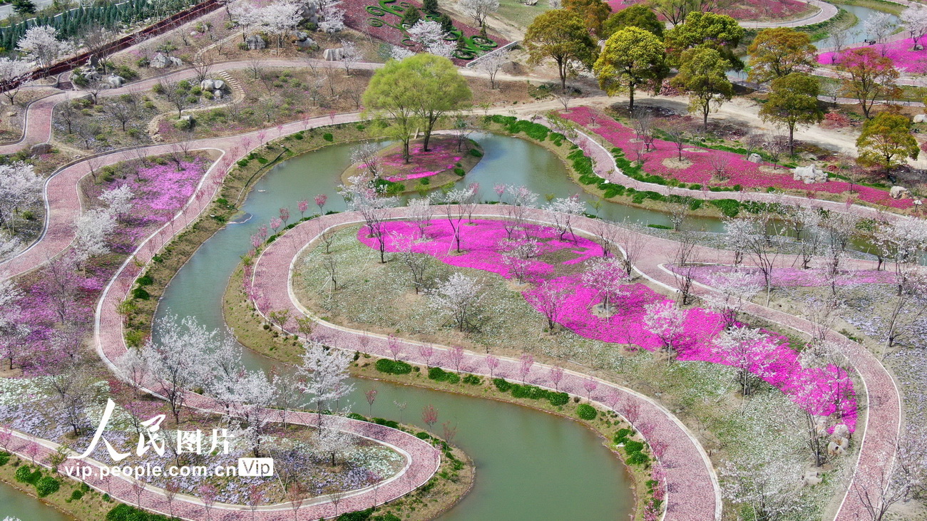 3月24日,俯瞰開沙島洲際夢幻島美麗景色。位于江蘇南通開沙島的洲際夢幻島迎來最美“花季”,芝櫻、美人梅、櫻花競相綻放,色彩繽紛。許叢軍/人民圖片