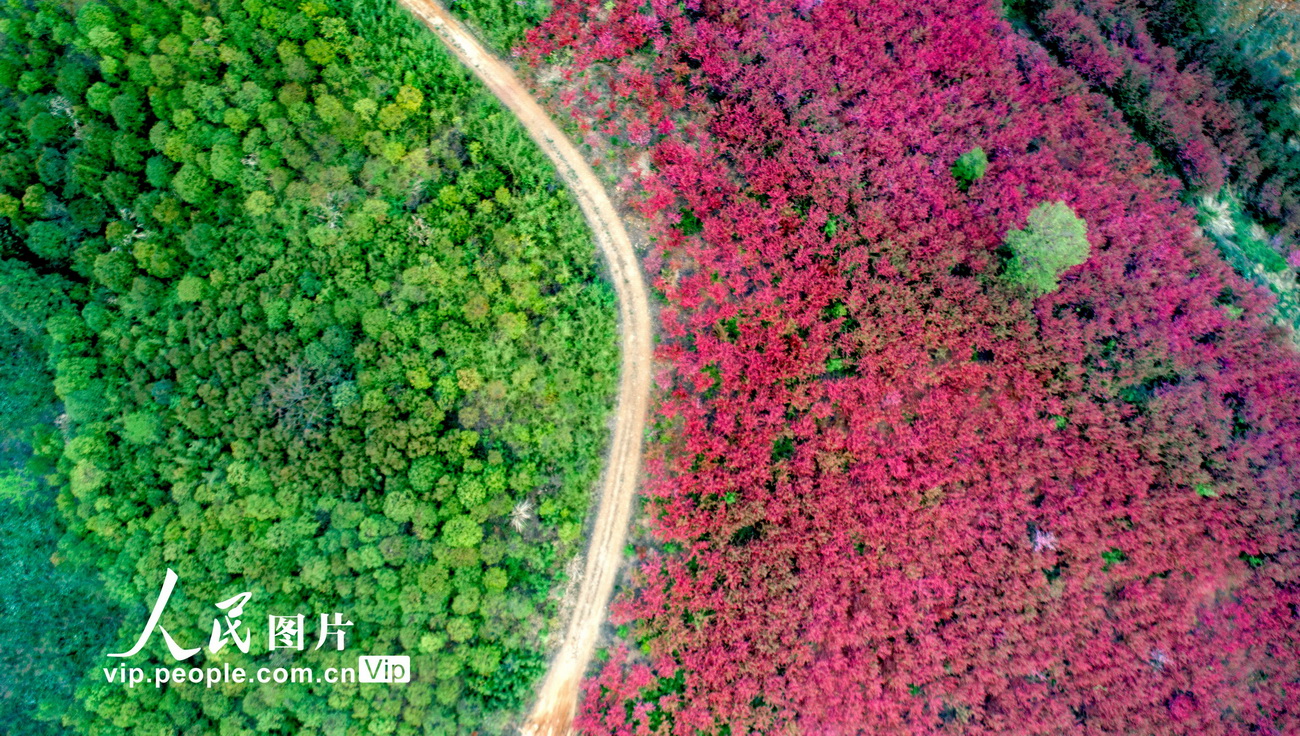 2020年3月24日,位于安徽省銅陵市郊區千年古鎮大通鎮境內的鴻基林業示范園區,千畝海棠花競相綻放,省道S221穿境而過,一簇簇如霞似火的花海與郁郁蔥蔥的林木、蜿蜒的道路交相呼應,構成一幅絢麗多彩的畫卷。陳磊/人民圖片