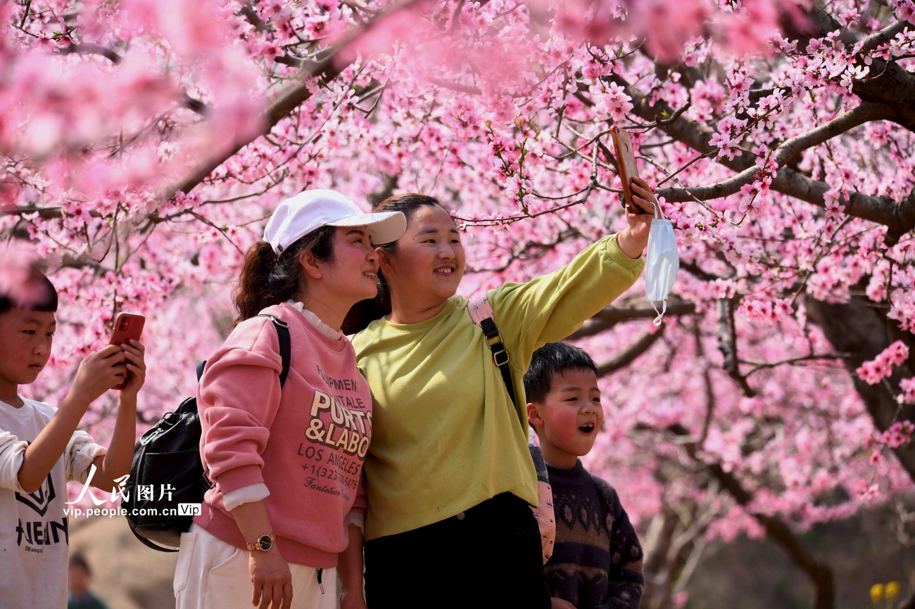 2020年3月24日,游人陶醉在花海中玩起了自拍。春暖花開,位于黃泛區的河南省西華縣黃橋鄉桃花盛開,勾畫出人間最美的三月美景。梁照曾/人民圖片