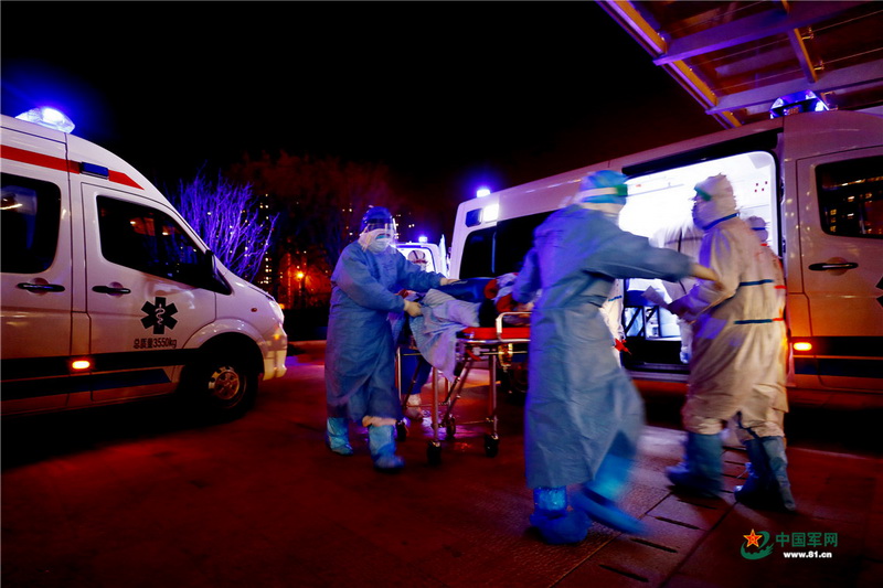 3月14日,武漢泰康同濟醫院接診大廳內,軍隊支援湖北醫療隊隊員正在接收轉運來的患者 。王皓宇攝