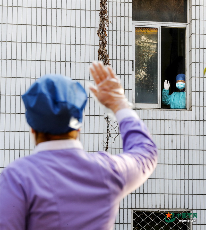 在戰“疫”一線,丈夫楊波是中部戰區總醫院感染科七病區主任,疫情發生以來就自我隔離了。圖為2月9日,妻子唐伏秋護士長路過丈夫科室的窗前給他打個電話,兩個人就這樣打個招呼。王皓宇攝