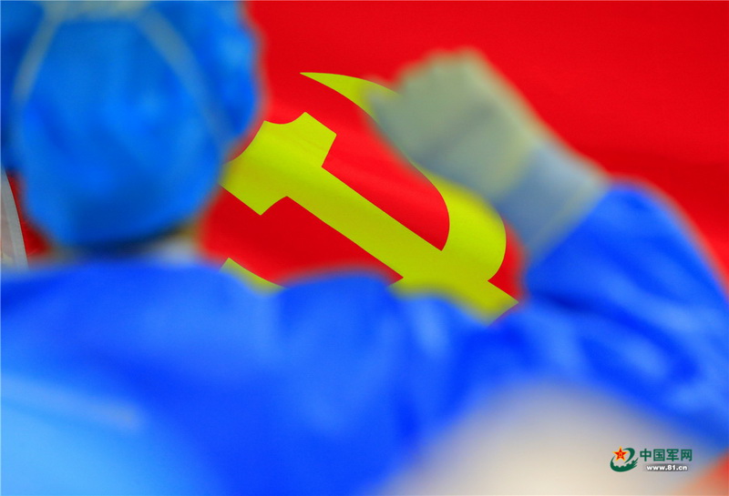1月29日,中部戰區總醫院支援武漢市肺科醫院醫療隊劉孟麗護士長,在一線病房向黨旗宣誓:人民軍醫,誓死不退。王皓宇攝