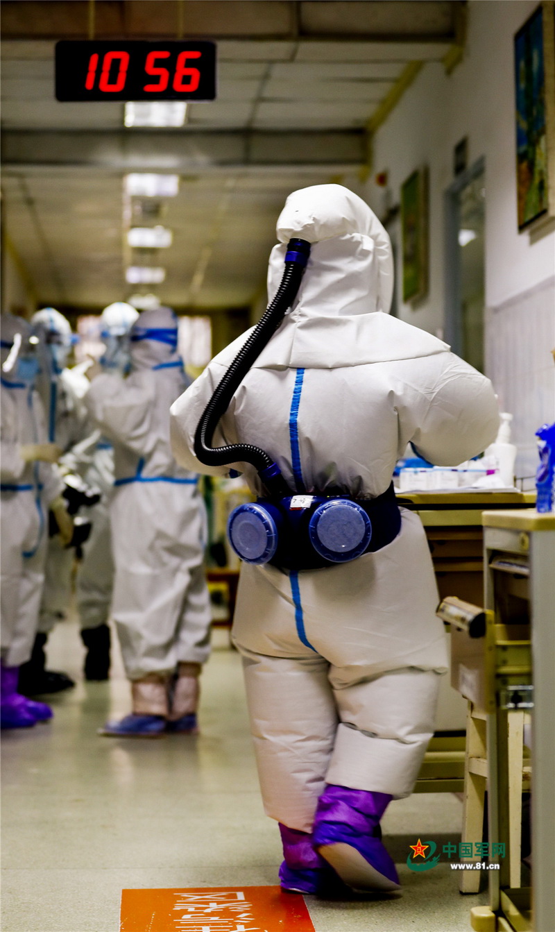 2月15日,中部戰區總醫院感染科病房內,醫護人員穿著正壓面罩正在走向搶救室,搶救重癥患者。王皓宇攝
