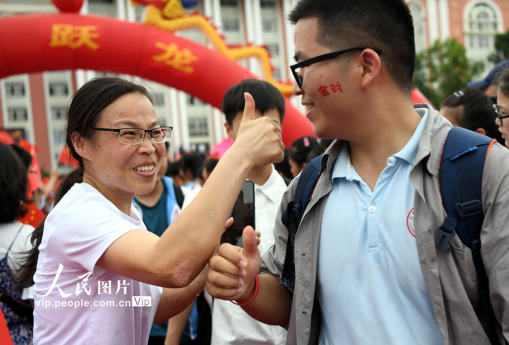 2020年7月7日,江西高三畢業班學子將步入考場,5日,南昌市新建二中大門前的操場上旗幟飛舞、人聲鼎沸,該校千余名高三考生走紅地毯“過龍門”。高一和高二的學弟學妹們在紅毯旁夾道歡送,為畢業班的學生加油助威。高三的老師們也在歡送的人群中,師生們相互擊掌,熱情相擁。老師們勉勵學生們考試要沉著冷靜,學生們則向老師道珍重。三年的高中生涯即將結束,一些學生甚至哭紅了眼睛,難舍離別。時雨/人民圖片